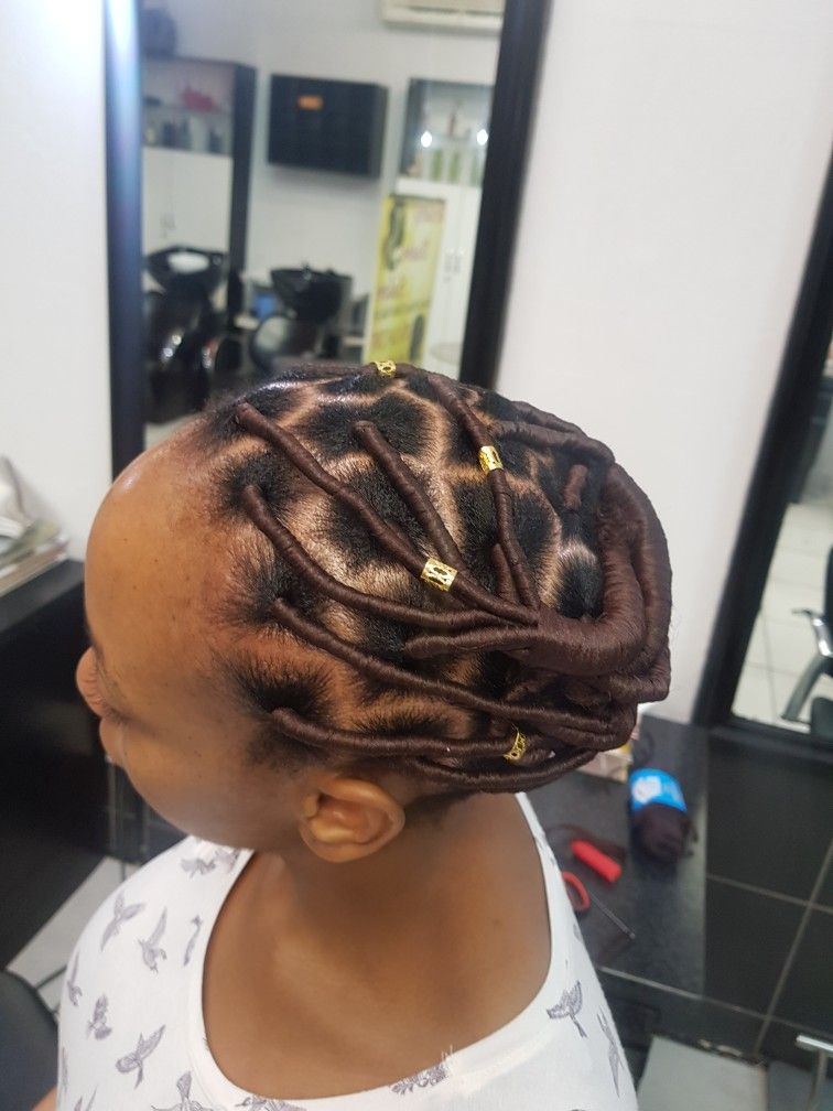 African Threading is best known as a way to stretch your hair. You may use threading to style your hair as well. When your hair is woven, you can wear it in a sleek up-do, make mini braids, chunky twists, or flat twists around your head.