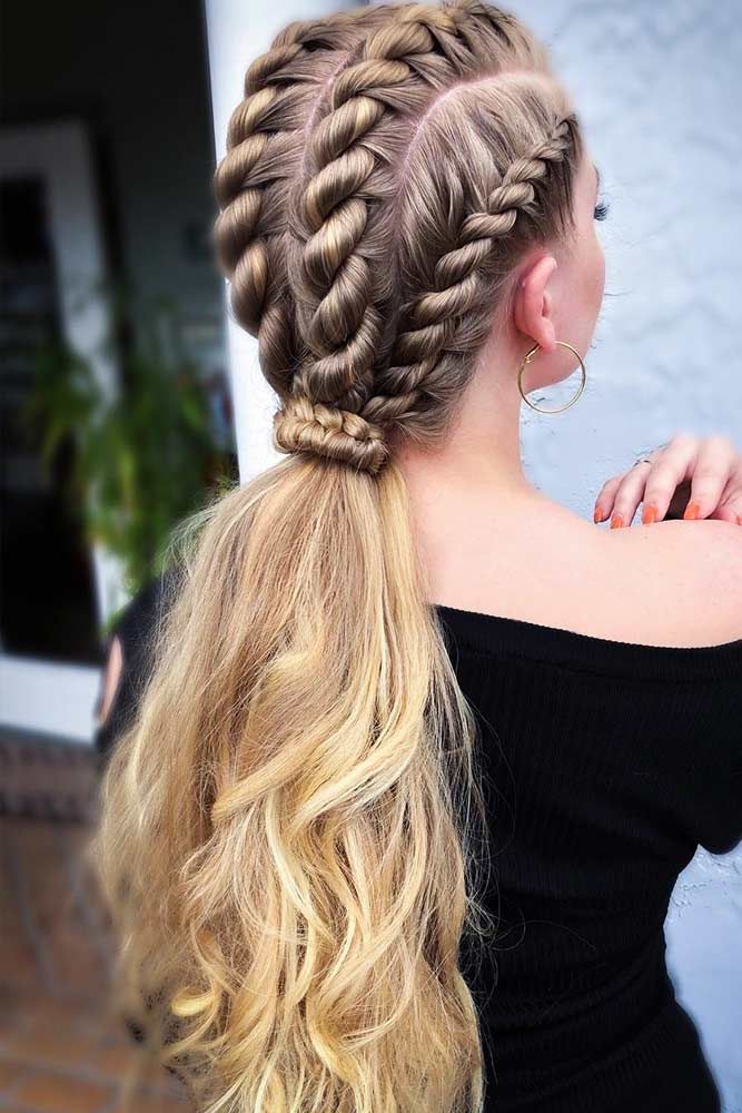 Here is a very refreshing braids hairstyle. It simply pleases the eyes so much and is sure to become one of the biggest hair trends in this new year and decade. The hair has been parted to both sides, and the hair on either sides have been braided in the style of big Dutch braids. The big braids help to create some volume and significance to the look. The hair is braided further down and then tied up into a tiny ponytail. This is the perfect look for weddings and parties, or even just one that will look great for your beach day pictures.