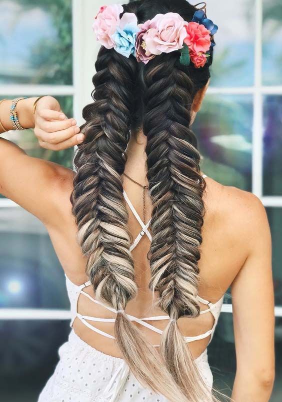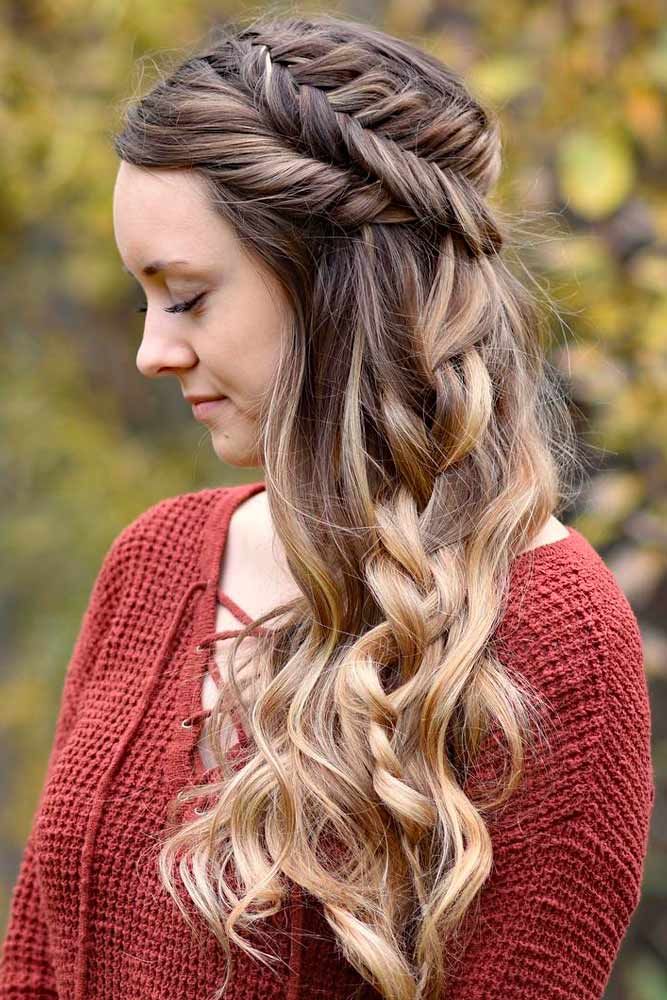 Dutch braids are amazing and they can surely transform any basic hairstyle into a very stylish and elegant one. And this beautiful hairstyle also features a beautiful transition from dark hair to light blonde hair as it comes down towards the bottom making it look great. The side braids have been tied up very loosely making it quite an elegant hairstyle that can be worn to weddings, parties and other such events.
