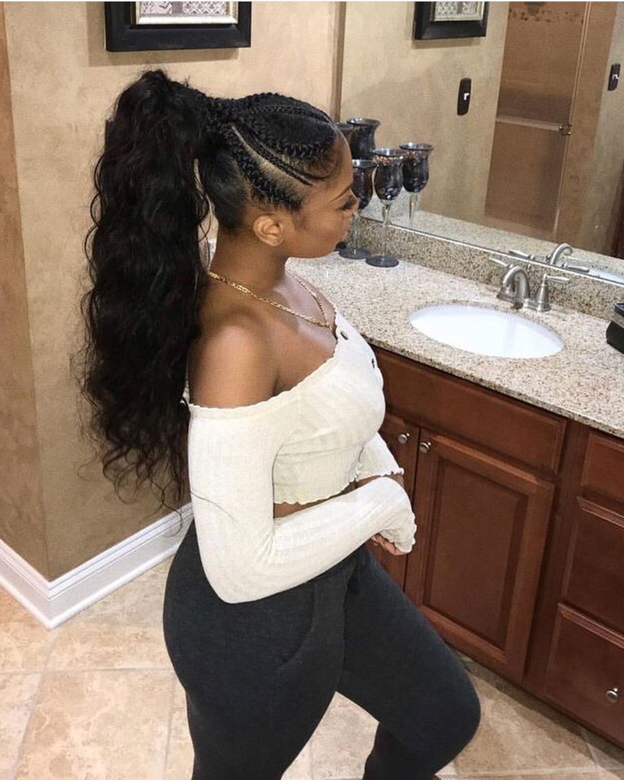 Show the globe that you are a fierce and classy woman with a ponytail like this one. This ponytail is edgy. The hair on the top is braided into a trendy pattern and therefore the actual ponytail itself is long. This style is finished off with a gold accessory. We love the gold accessory because it gives the hair a luxury and glam look. Wear a ponytail like this with a leather outfit like featured to actually wow.