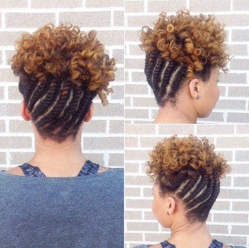 There’s no end to a variety of designs one can try with braiding. This mohawk with braids blends curvy cornrows with one point burst rows for a jazzy Mohawk to suit a woman who shies away from wearing boring hair.
