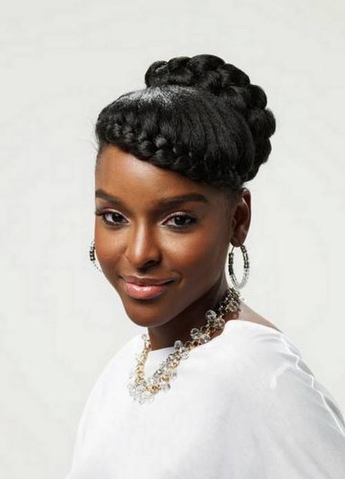 Braided updos are elegant and sophisticated but still fun, and they’re versatile and full of flavor, so every woman can choose her own style. This look begins with cornrows that lead to a thick, braided bun. High top knots such as this one are classy and compatible with any outfit.