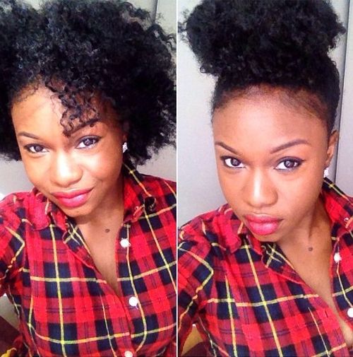 Never underestimate the power of a bold bun for a trendy everyday look. This high natural black hairstyle works best with thick curly hair. Create a full style with a few messy pieces for added sass.