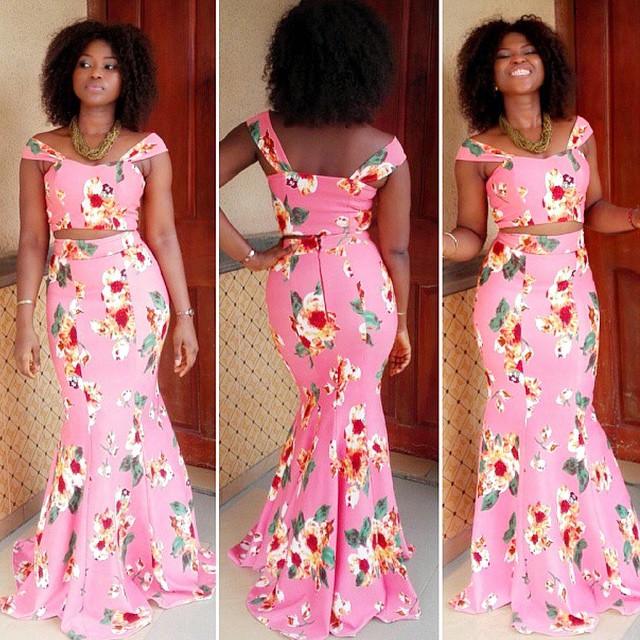 If you like colorful clothes and flora effect on your dresses, it is time to look this dress. The dress is in tight shape and it is good to show your body curls. With afro type of curly hairs, you can be look as African princess.