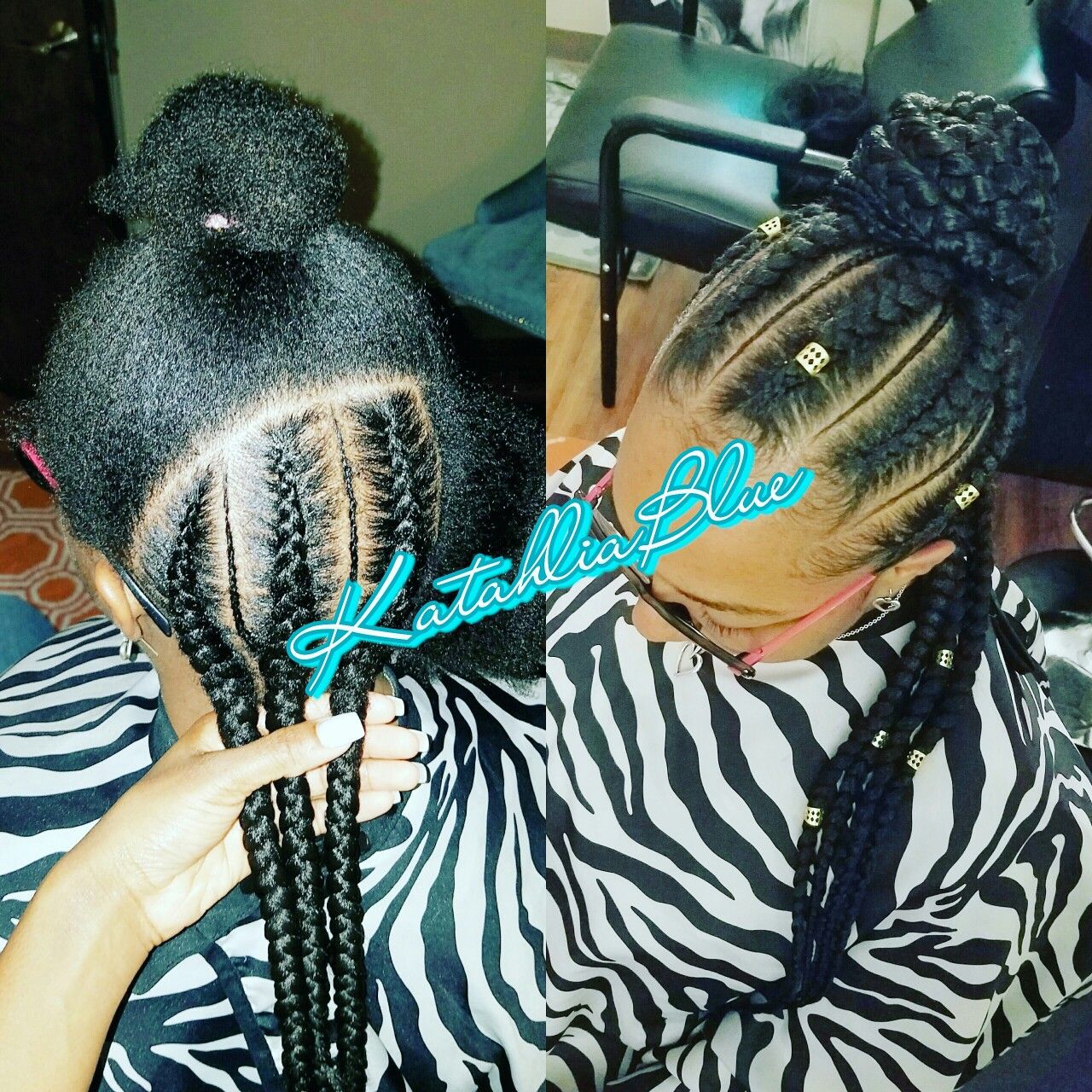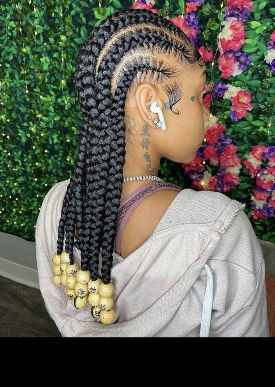 This hairstyle can be called Ghana weaving, banana braids, or fishbone braids.